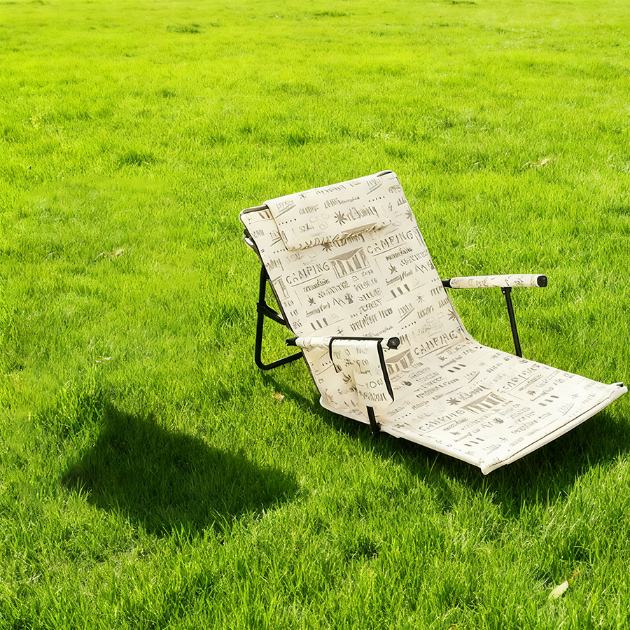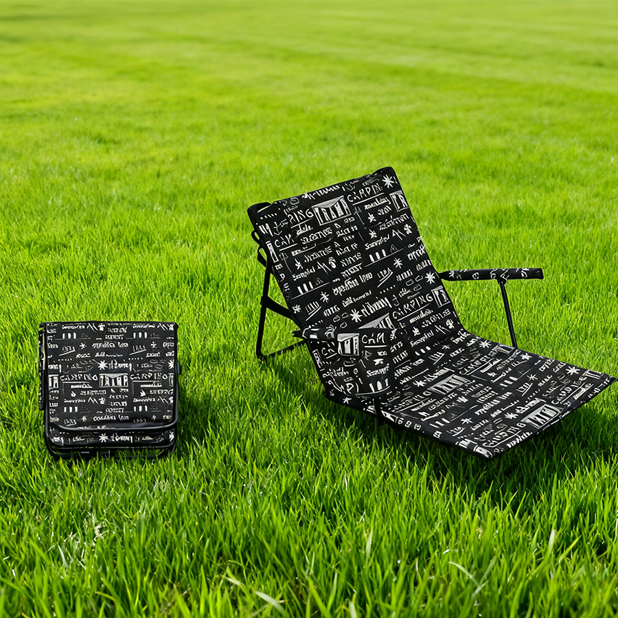 Le tissu durable présente un imprimé graphique moderne (probablement une couleur kaki/beige avec un texte sur le thème du camping), ajoutant une touche élégante à votre équipement de plein air. La chaise est construite sur un cadre en acier léger et pliable Se replie rapidement et facilement pour former un bloc carré compact, comme illustré. Son extrême portabilité permet de le ranger facilement dans un coffre, sous un lit ou de le transporter grâce à sa poignée intégrée.