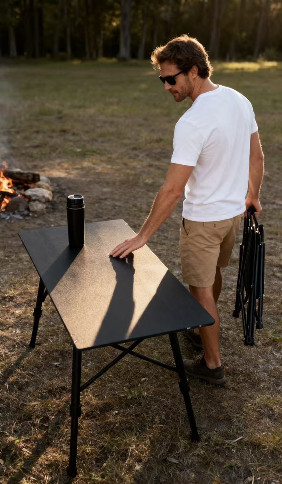- Hauteur réglable : Personnalisez facilement la hauteur de la table selon vos besoins, que vous soyez assis sur une chaise de camping, pour un pique-nique discret ou debout pour préparer vos repas. Le mécanisme de verrouillage sécurisé maintient la table stable à la hauteur souhaitée.