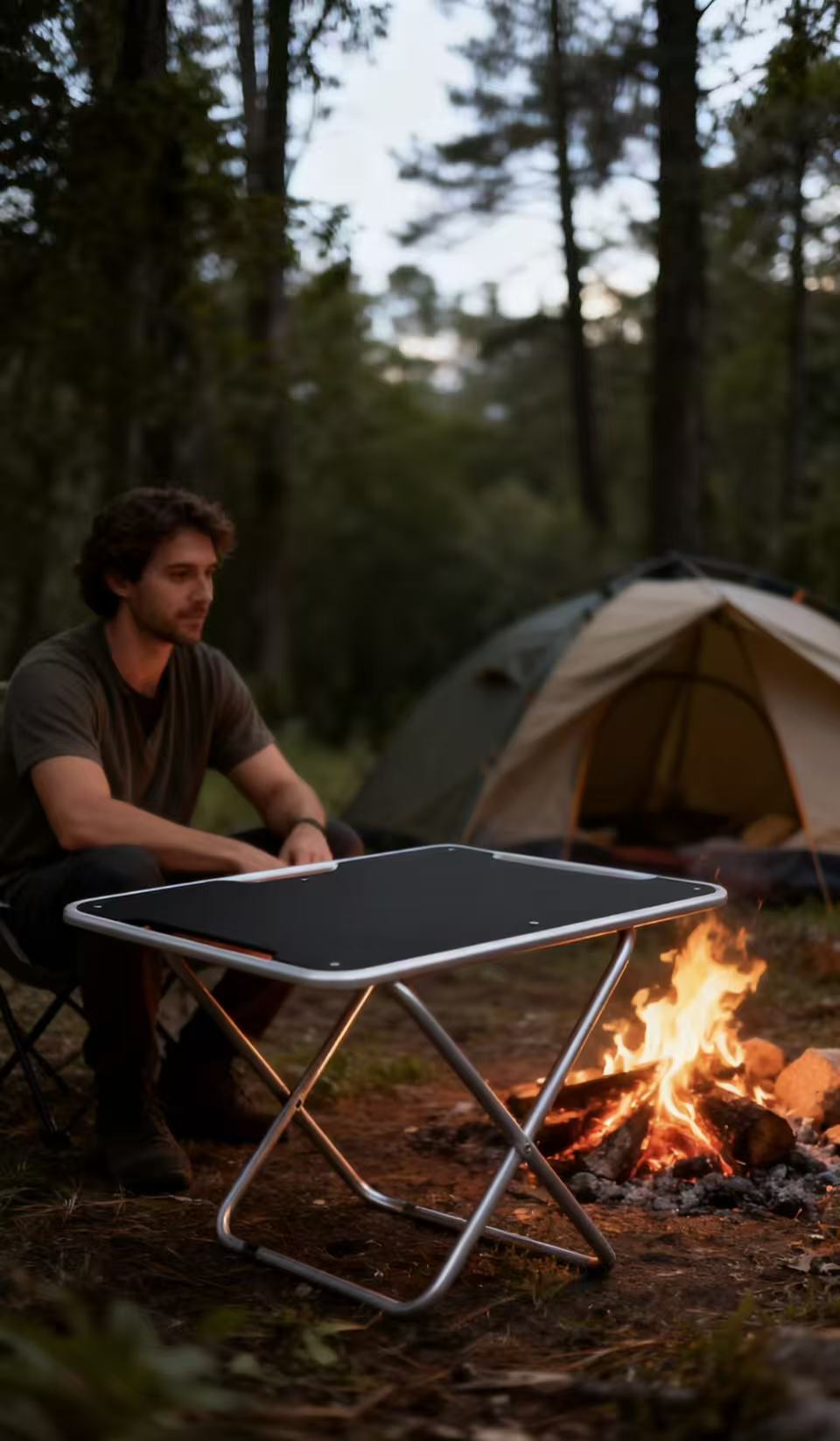 - Dimensioni perfettamente compatte: Il piano del tavolo offre spazio sufficiente per l'essenziale: una bevanda, un libro, un piccolo fornello da campeggio o oggetti personali. È ideale per situazioni in cui lo spazio è limitato, come all'interno di una tenda, accanto a una sedia da campeggio o sul balcone di un piccolo appartamento.